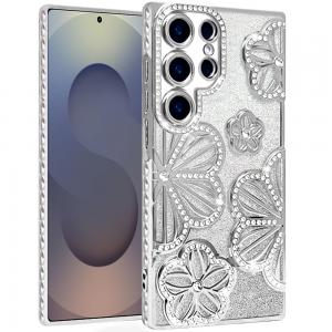 For Samsung s26 Ultra Lavished Floral Butterfly Bling Stones Hybrid Case - Silve...