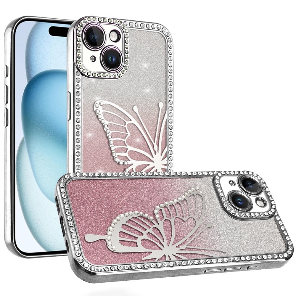 For iPhone 15 Electroplated Butterfly With Diamonds Glitter Shimmer Hybrid Case - Silver