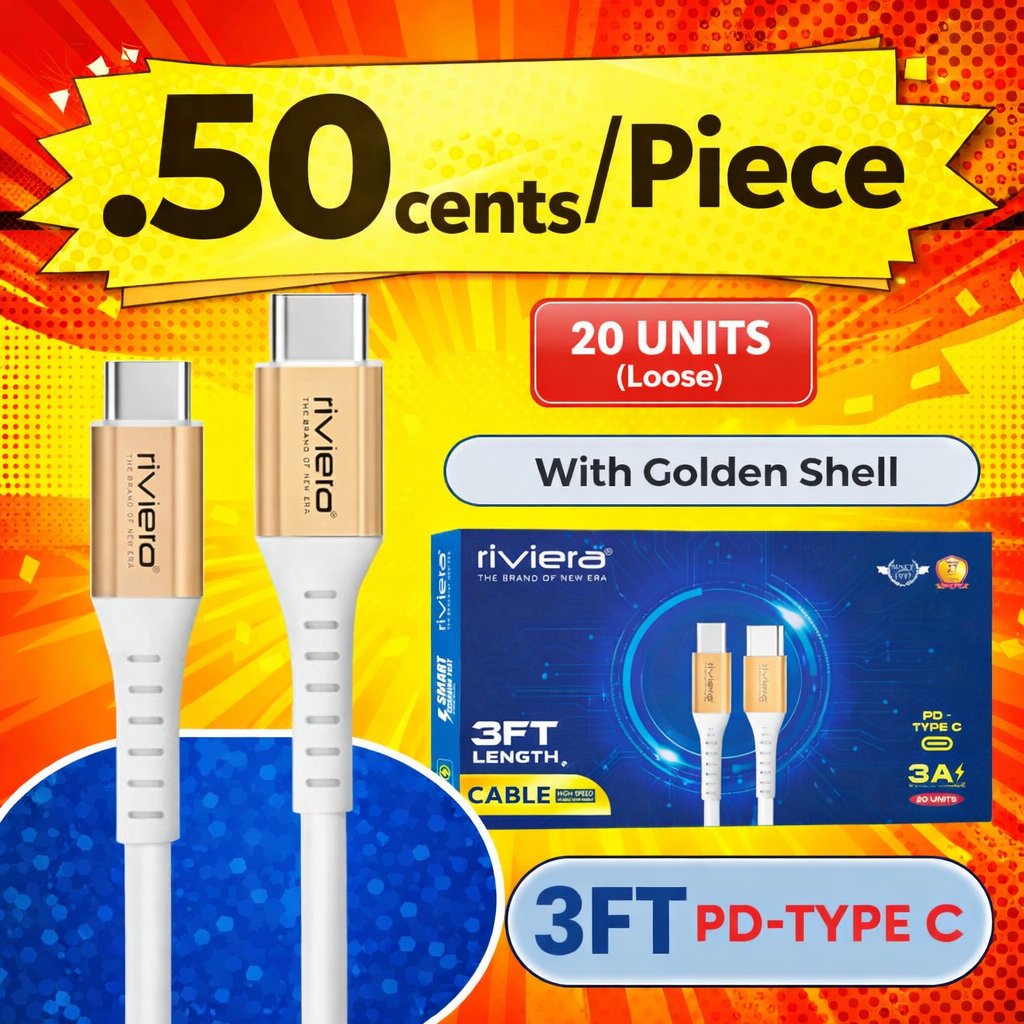 .50 cents Each Pack of 20 LOOSE Cable in CounterDisplay Box - 3FT Fast Charging Cable [Type C - Type C (PD)] - White w/ Golden Shell (22)
