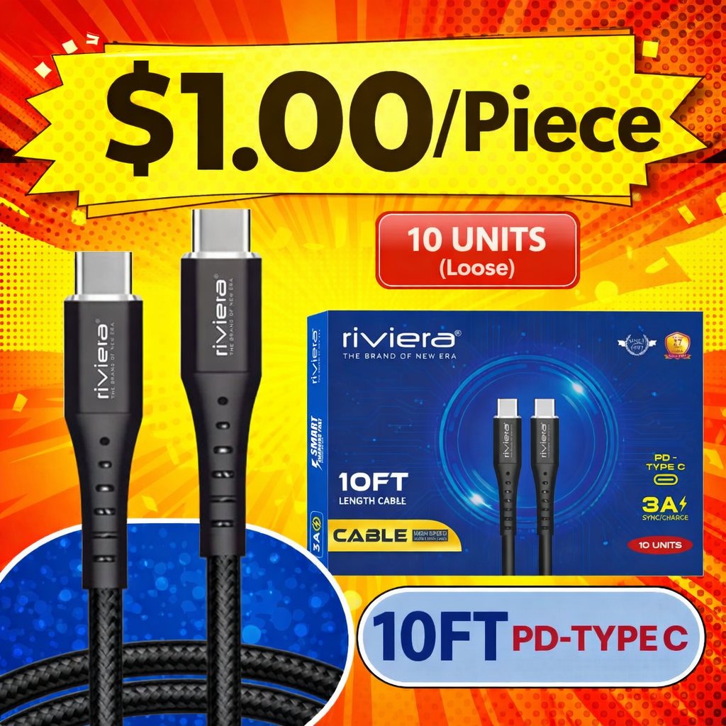$1.00 Each Pack of 10 LOOSE Cable in CounterDisplay Box - 10FT Fast Charging Cable [Type C - Type C (PD)] - Black w/ Black Shell (30)