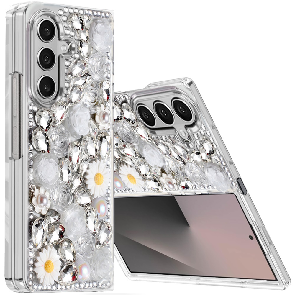 For Samsung Z Fold 7 Spectacular Full Bling Stones Glitter HQ Hybrid Floral Series - White