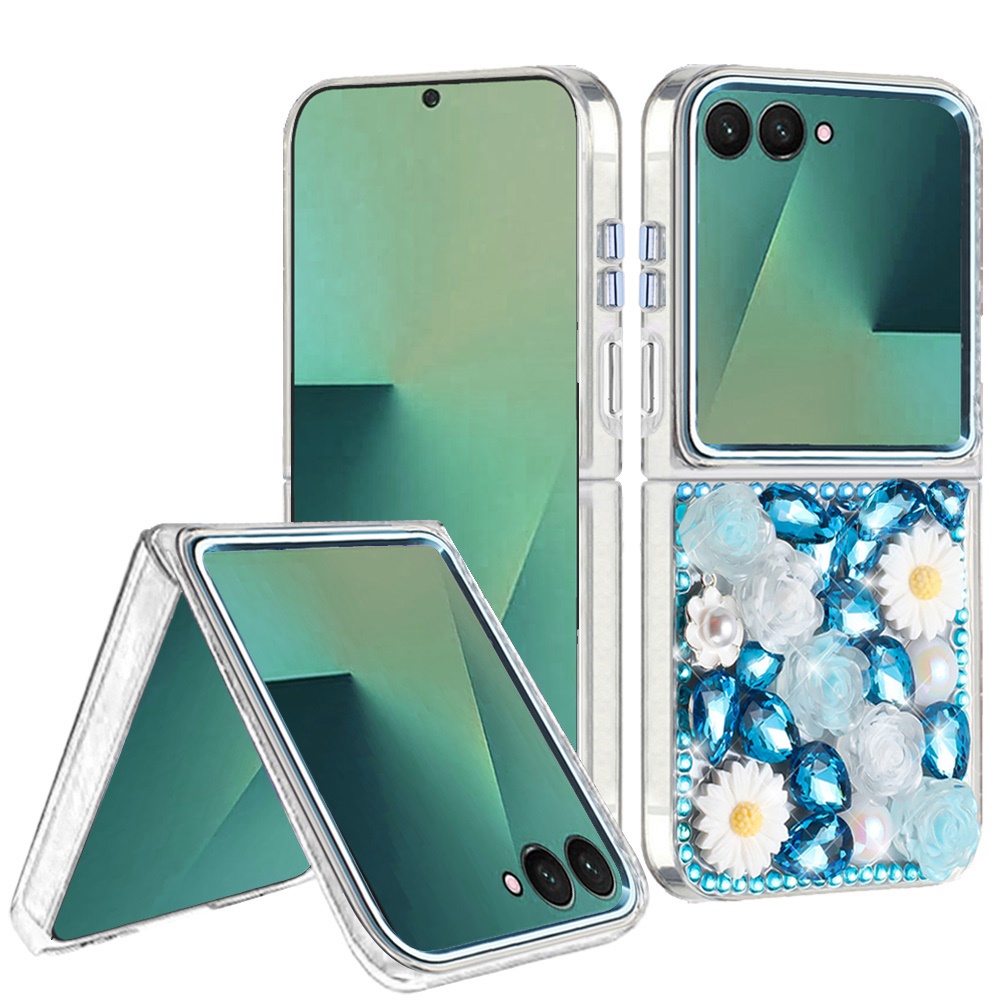 For Samsung Z Flip 7 Spectacular Full Bling Stones Glitter HQ Hybrid Floral Series - Blue