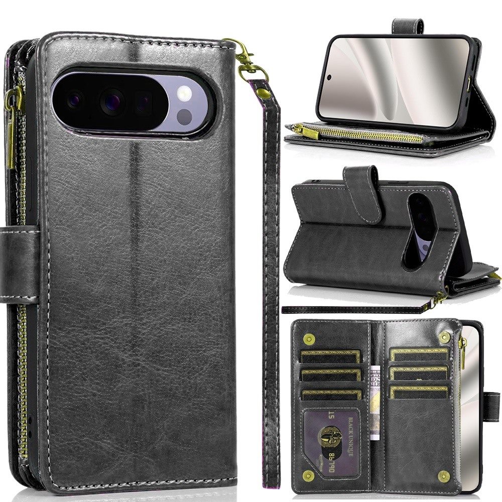 For Google Pixel 10 Pro XL Jewel Wallet Design with Stitched PU Leather ID Card Money Holder Zipper Case - Black