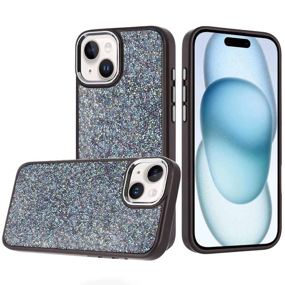 For iPhone 15 Crystal Glass Diamond with Metallic Buttons and Edges Hybrid Case - Black