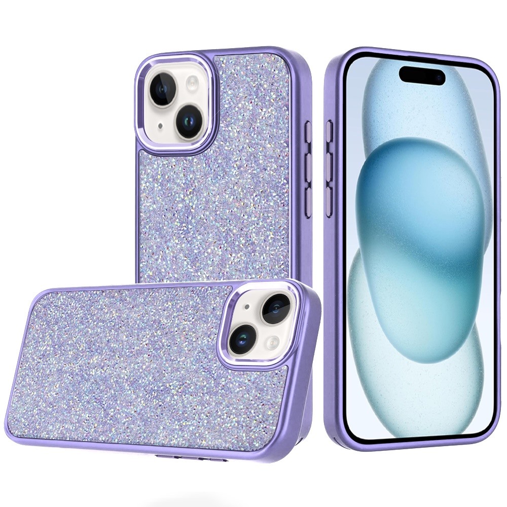 For iPhone 15 Crystal Glass Diamond with Metallic Buttons and Edges Hybrid Case - Dark Purple