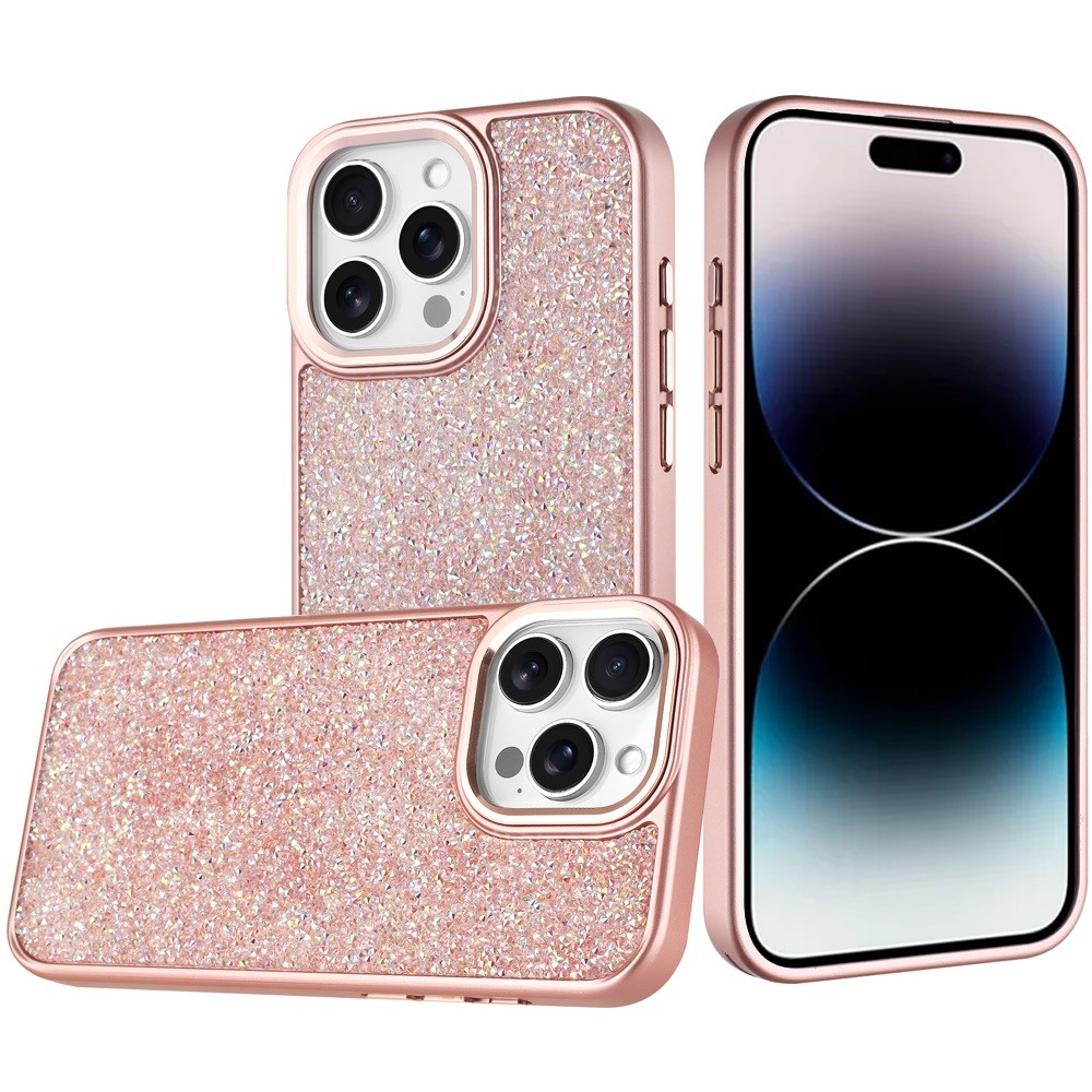 For iPhone 14 PRO MAX 6.7" Crystal Glass Diamond with Metallic Buttons and Edges Hybrid Case - Rose Gold