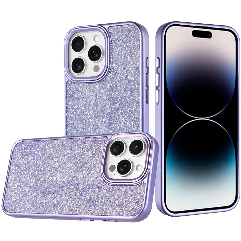 For iPhone 14 PRO MAX 6.7" Crystal Glass Diamond with Metallic Buttons and Edges Hybrid Case - Dark Purple