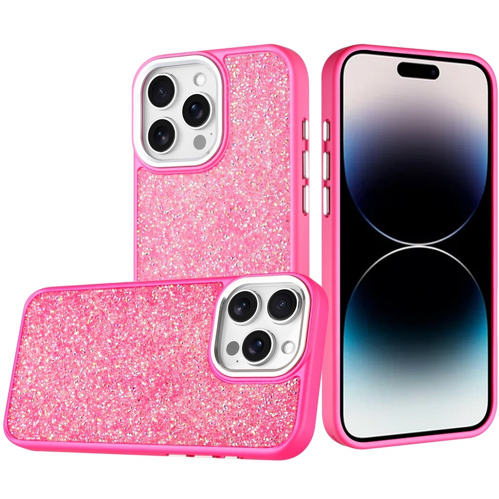 For iPhone 14 PRO MAX 6.7" Crystal Glass Diamond with Metallic Buttons and Edges Hybrid Case - Hot Pink
