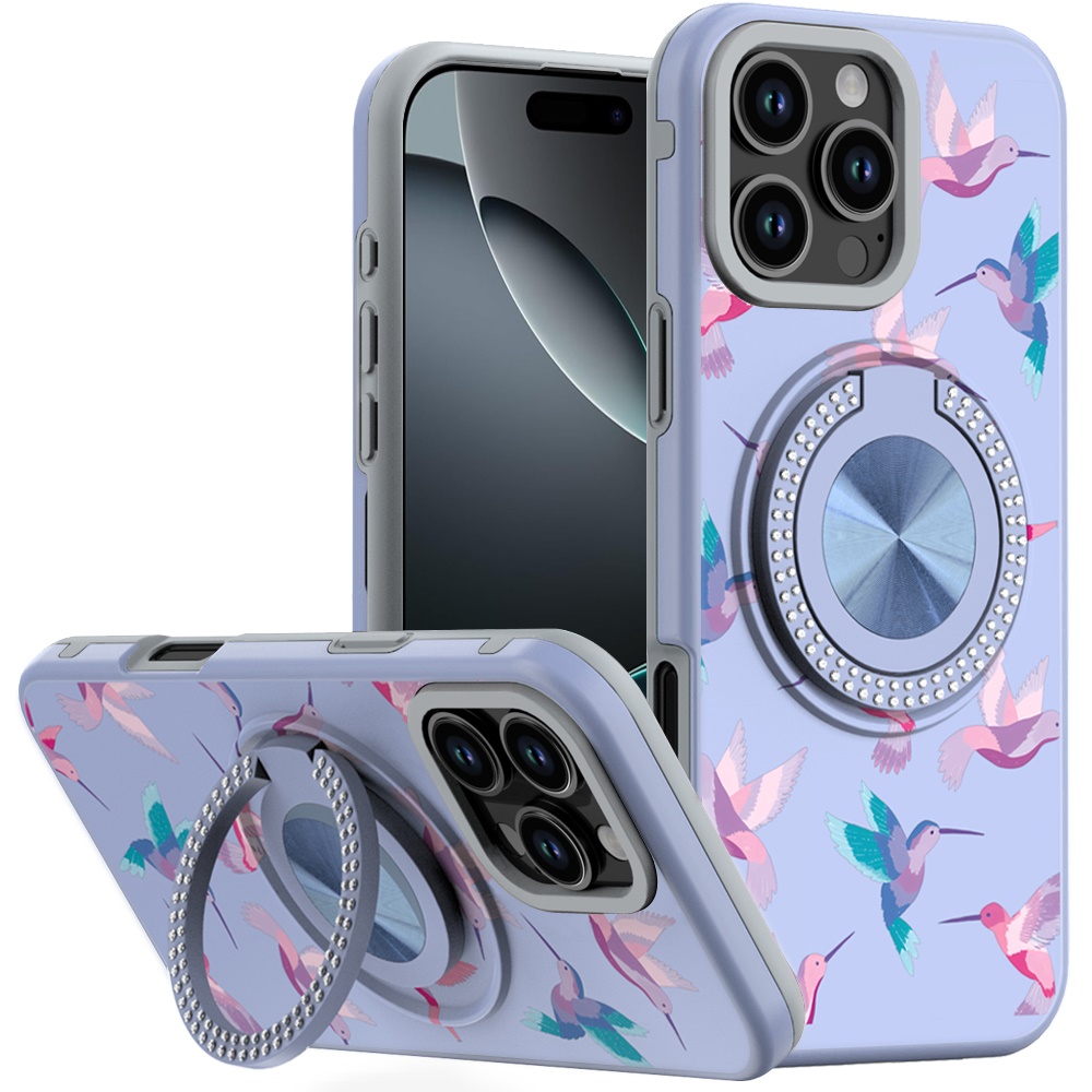For iPhone 16 Pro Max 6.9 Metal Diamond CD Pattern Design Matte Finished Hybrid with Rotational Ring [Car Mount Friendly] Case - Hummingbird & Floral