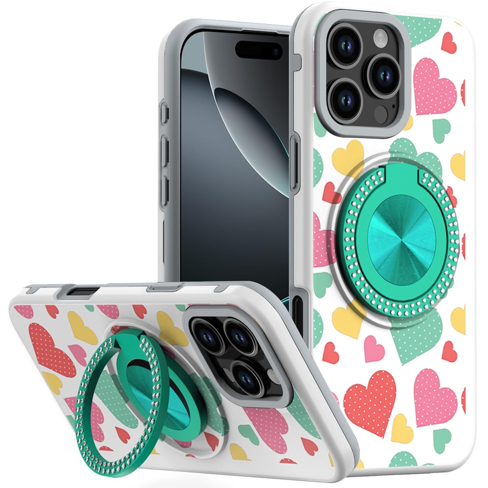 For iPhone 16 Pro Max 6.9 Metal Diamond CD Pattern Design Matte Finished Hybrid with Rotational Ring [Car Mount Friendly] Case - Pastel Hearts