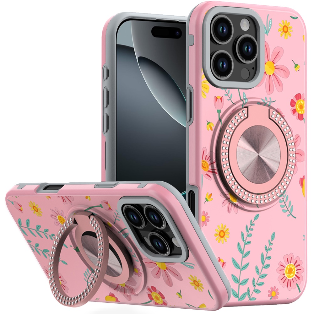 For iPhone 16 Pro Max 6.9 Metal Diamond CD Pattern Design Matte Finished Hybrid with Rotational Ring [Car Mount Friendly] Case - Pink with Daisies and Floral