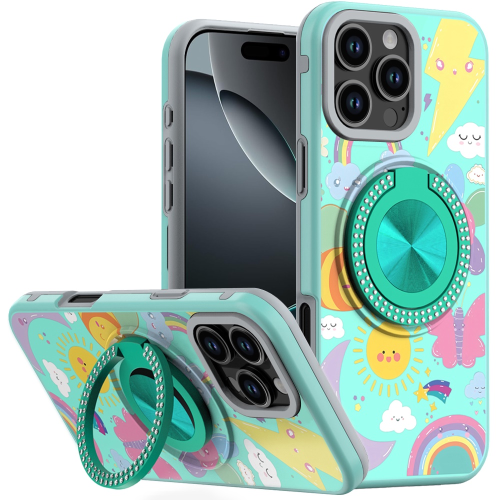 For iPhone 16 Pro Max 6.9 Metal Diamond CD Pattern Design Matte Finished Hybrid with Rotational Ring [Car Mount Friendly] Case - Aqua with Celestial Sun Rainbows