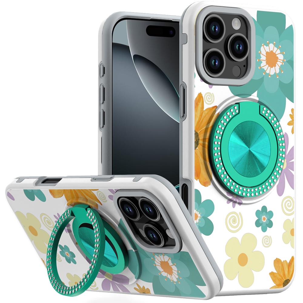 For iPhone 16 Pro Max 6.9 Metal Diamond CD Pattern Design Matte Finished Hybrid with Rotational Ring [Car Mount Friendly] Case - Yellow & Purple Flowers