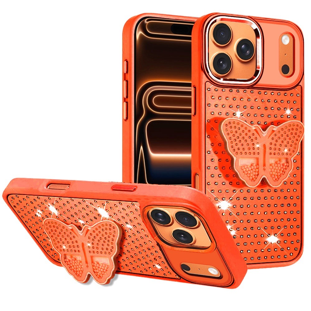 For iPhone 17 Pro Max Butterfly Moveable Grip Stand With Small Diamonds Meta Buttons HQ Hybrid - Cosmic Orange