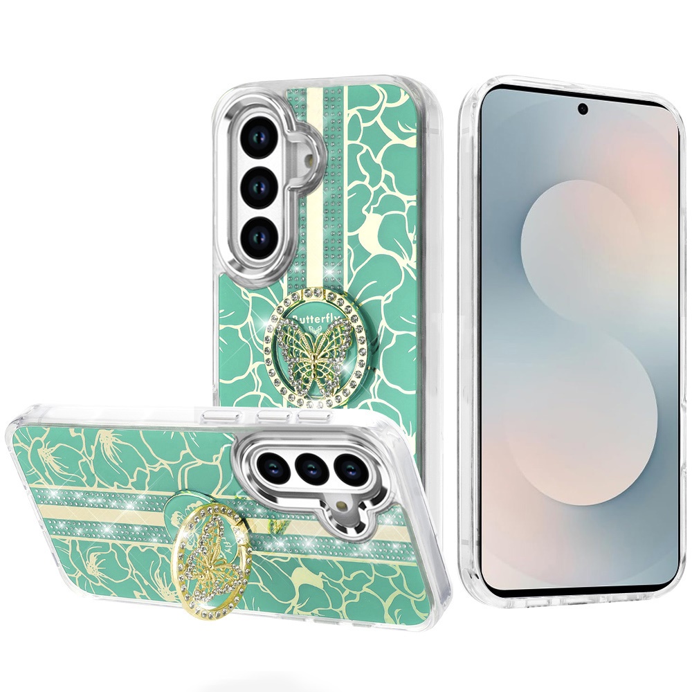 For Samsung s26 Plus Splendid Floral Designs with Metal Camera and Buttons with Butterfly Ring Stand Hybrid Case - Light Green