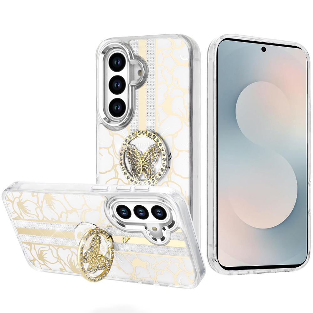 For Samsung s26 Plus Splendid Floral Designs with Metal Camera and Buttons with Butterfly Ring Stand Hybrid Case - White