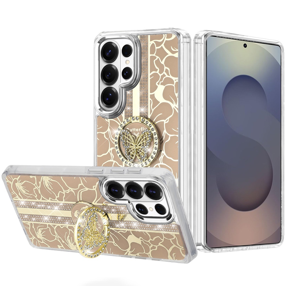 For Samsung s26 Ultra Splendid Floral Designs with Metal Camera and Buttons with Butterfly Ring Stand Hybrid Case - Gold