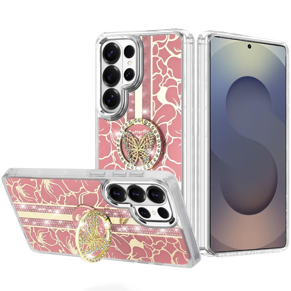 For Samsung s26 Ultra Splendid Floral Designs with Metal Camera and Buttons with Butterfly Ring Stand Hybrid Case - Light Pink