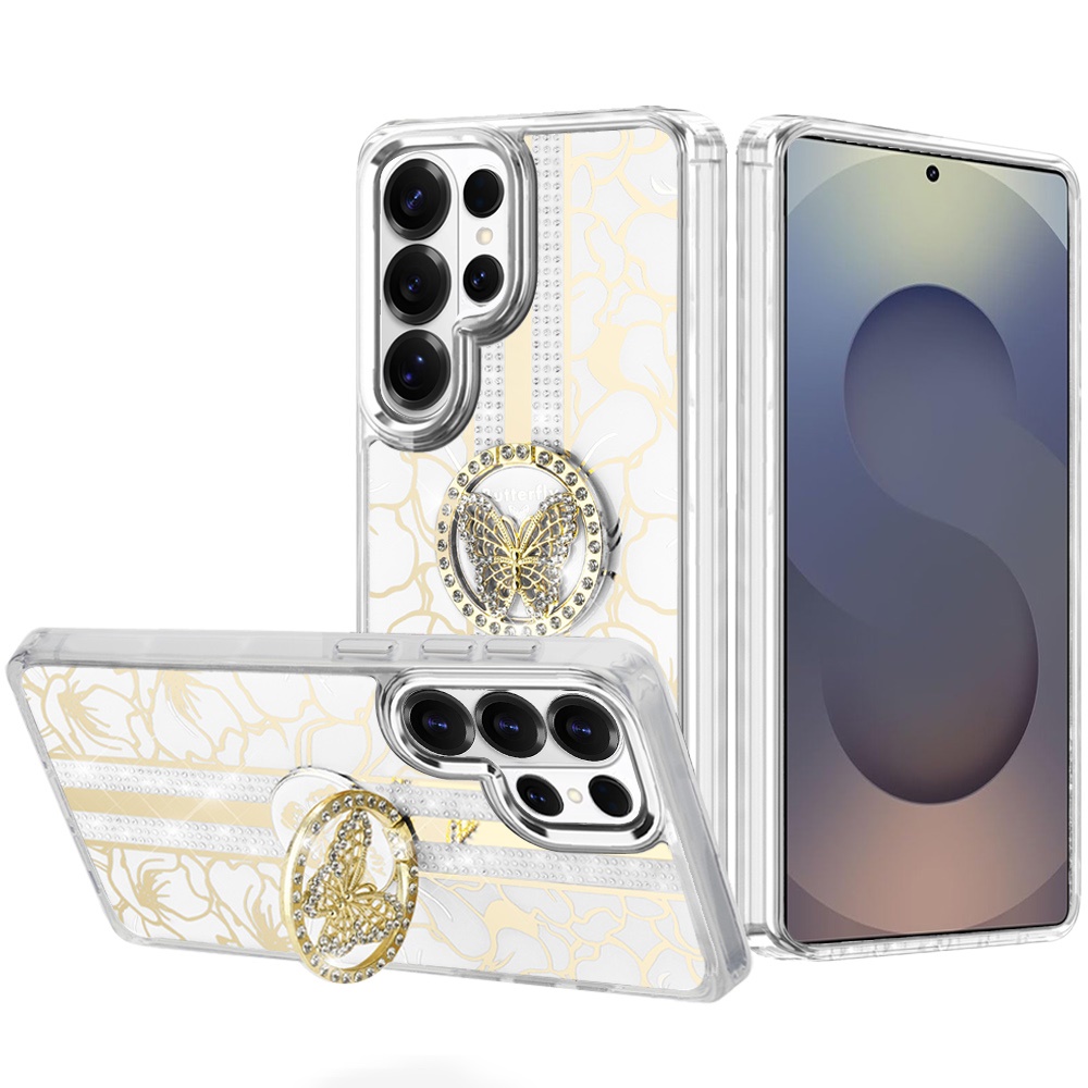 For Samsung s26 Ultra Splendid Floral Designs with Metal Camera and Buttons with Butterfly Ring Stand Hybrid Case - White