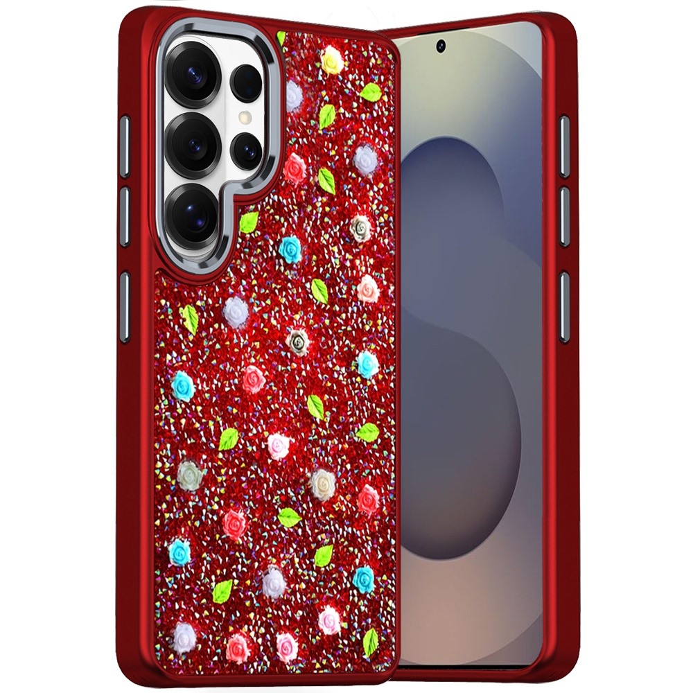 For Samsung s26 Ultra Stick-On Embedded Glass Diamonds of Colorful Floral Arrangement HQ Hybrid Case - Red