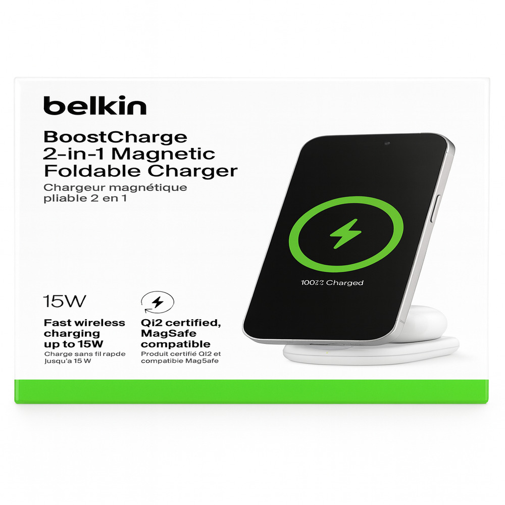 BELKIN BOOST CHARGE 2 IN 1 MAGNETIC FOLDABLE CHARGER 15W - QI2 CERTIFIED - MAGSAFE COMPATIBLE - 36 W TYPEC POWER ADAPTER AND 5 FT C-C CABLE INCLUDED - WHITE (B1 BELKIN#1)