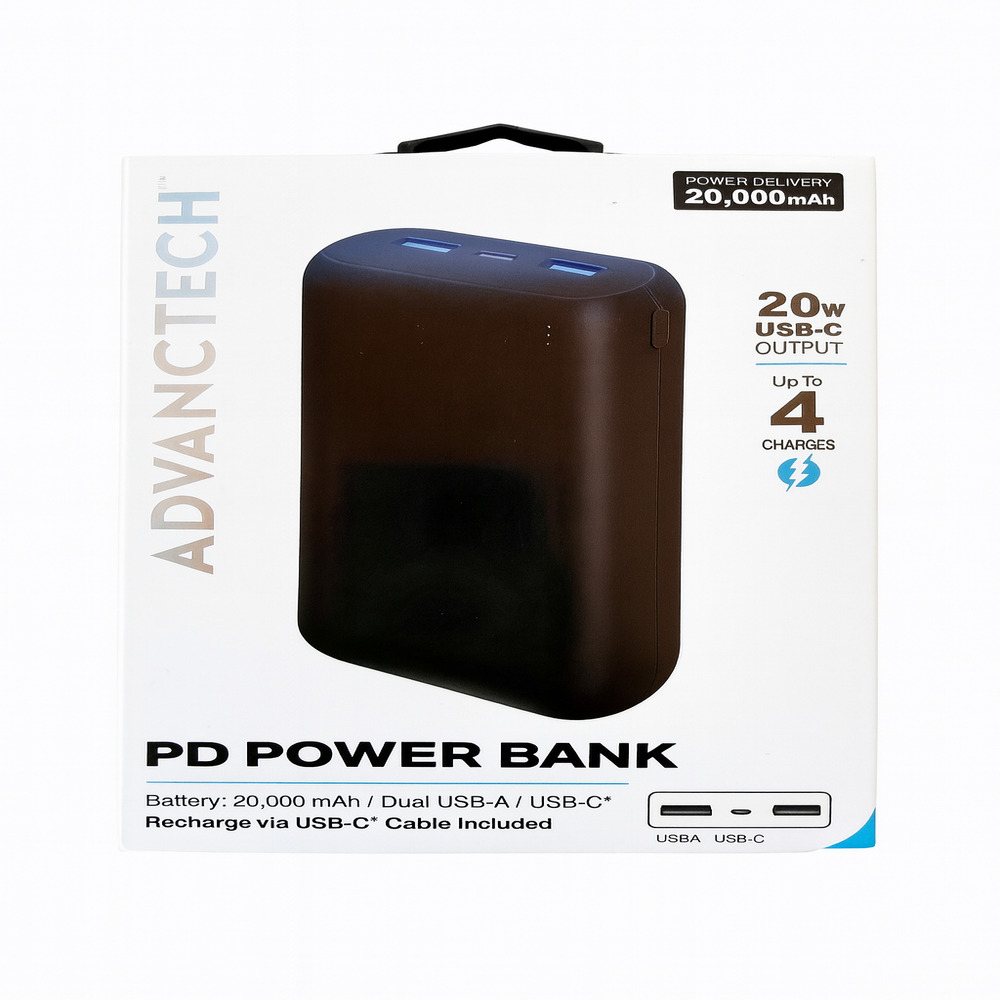 Advanctech 20W 20,000 Mah PD Power Bank with Dual USB A USB C Ports in Black - UPTO 4 CHARGES - TYPE C CABLE INCLUDED (D1)