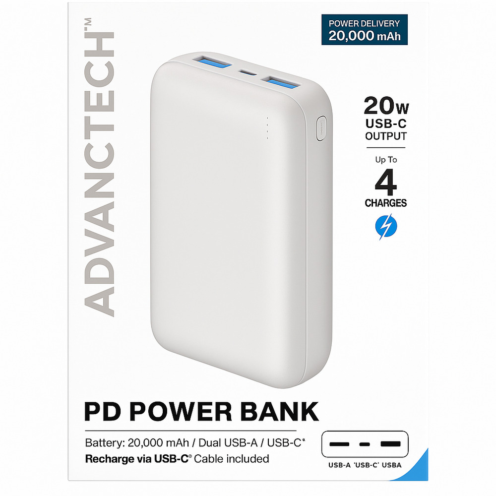 Advanctech 20W 20,000 Mah PD Power Bank with Dual USB A USB C Ports in WHITE - UPTO 4 CHARGES - TYPE C CABLE INCLUDED (D1)