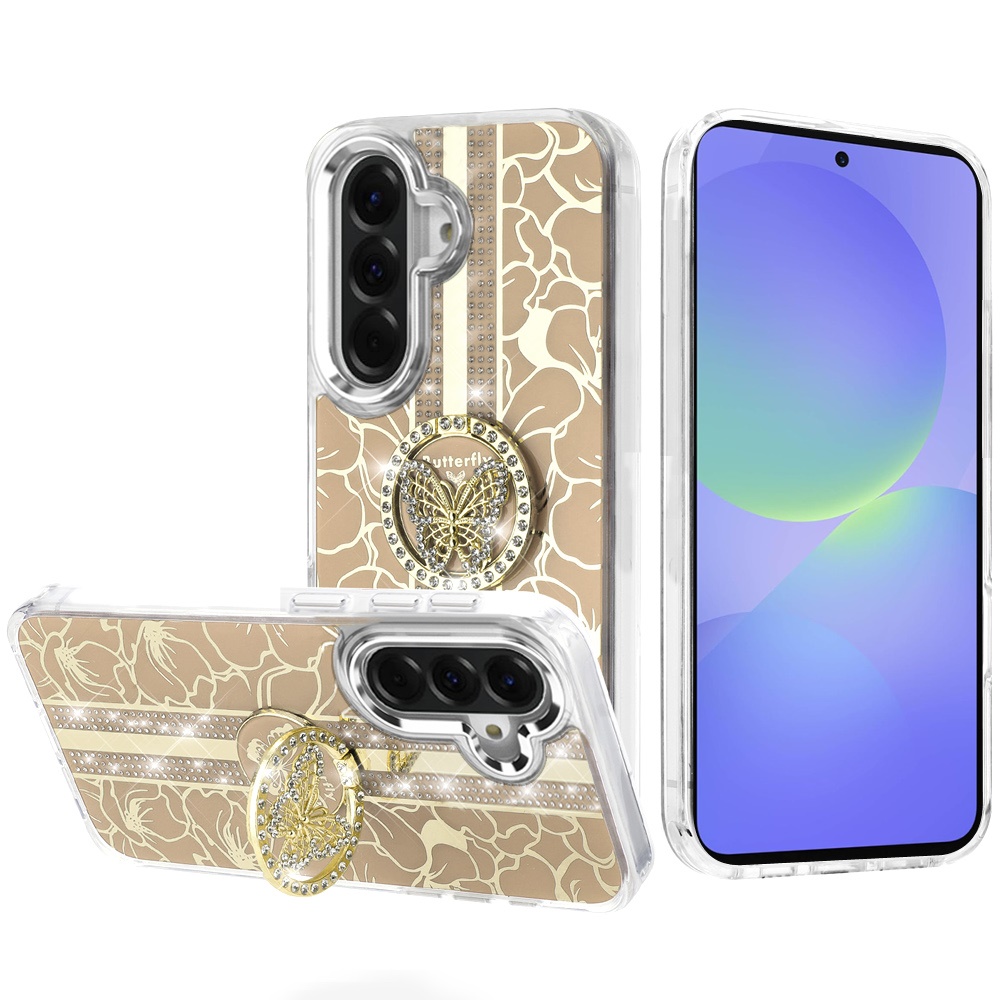 For Samsung Galaxy A37 Splendid Floral Designs with Metal Camera and Buttons with Butterfly Ring Stand Hybrid Case - Gold