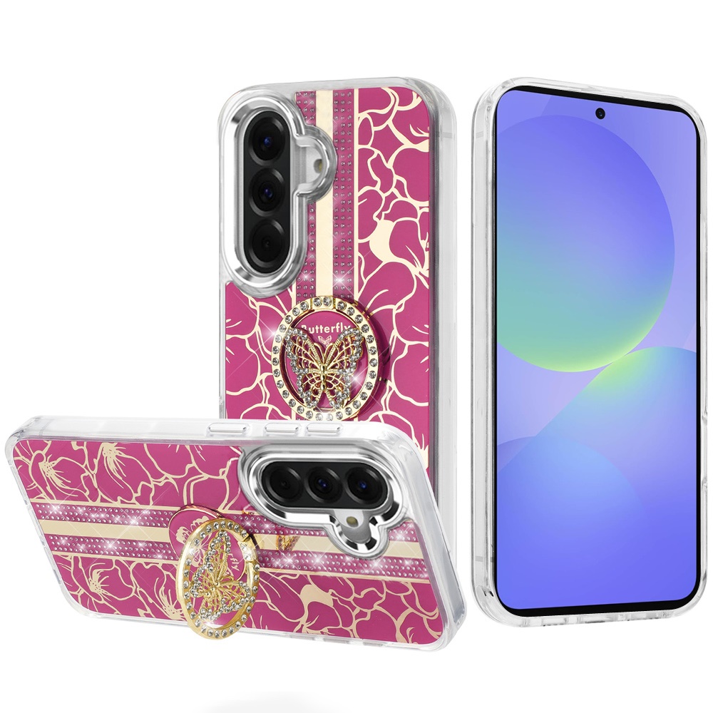For Samsung Galaxy A37 Splendid Floral Designs with Metal Camera and Buttons with Butterfly Ring Stand Hybrid Case - Hot Pink
