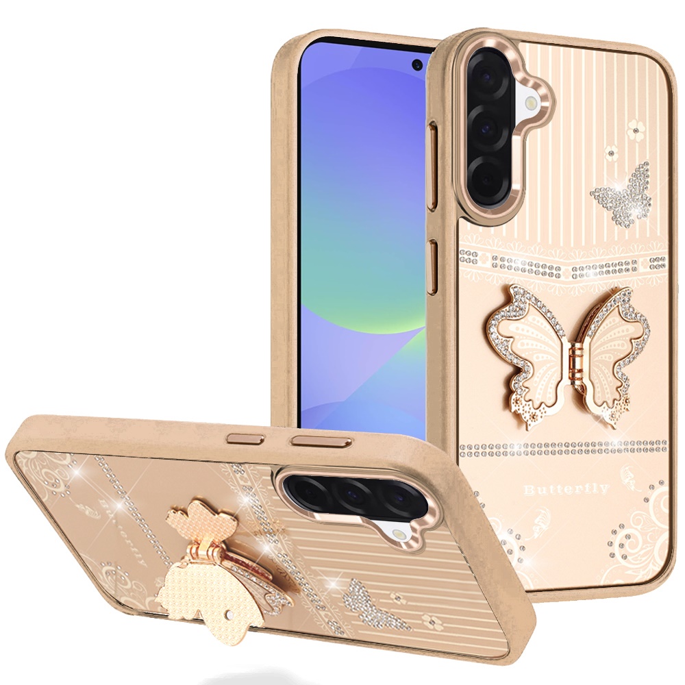 For Samsung Galaxy A37 Splendid Glitter Butterfly Design Stand with Metallic Edges Hybrid Case - Gold