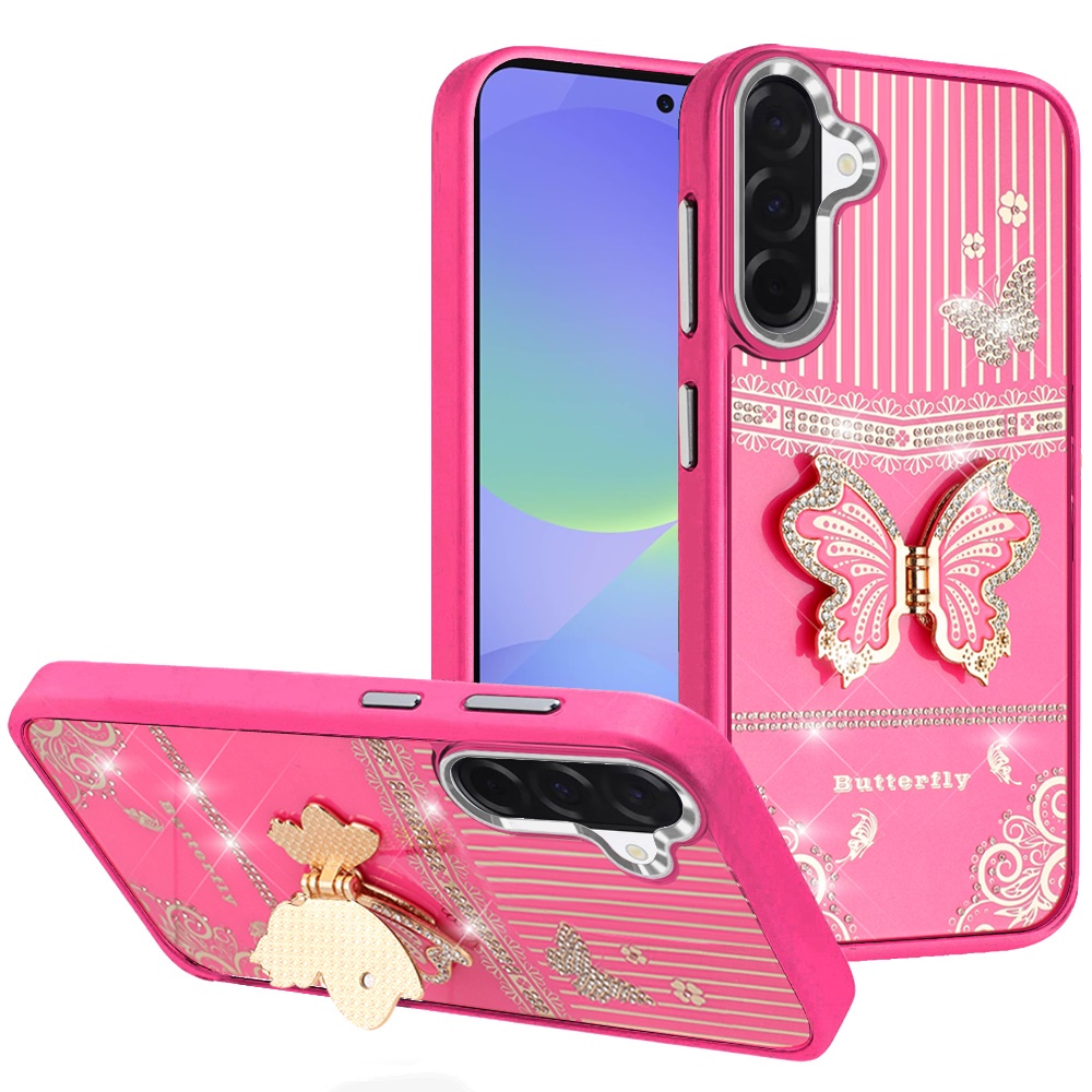 For Samsung Galaxy A37 Splendid Glitter Butterfly Design Stand with Metallic Edges Hybrid Case - Hot Pink