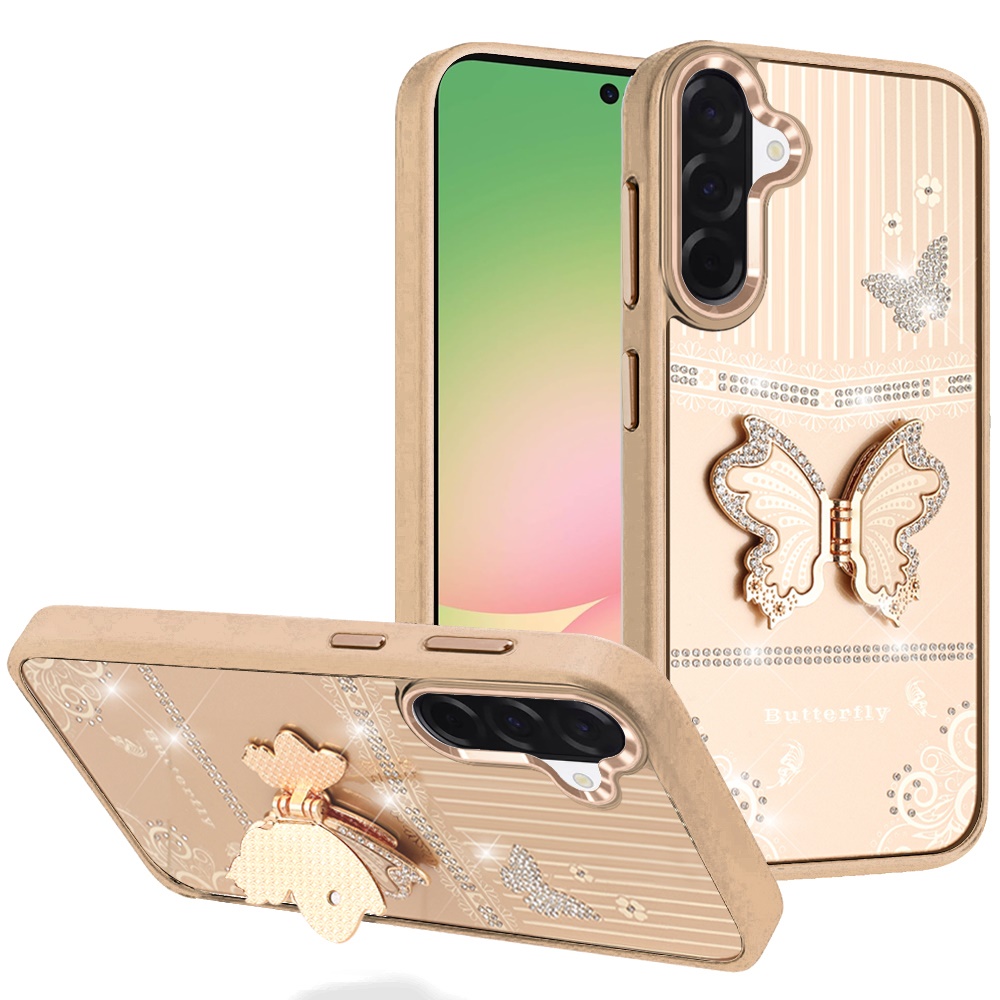 For Samsung Galaxy A57 Splendid Glitter Butterfly Design Stand with Metallic Edges Hybrid Case - Gold