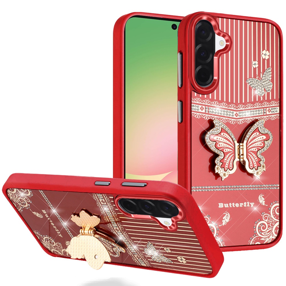 For Samsung Galaxy A57 Splendid Glitter Butterfly Design Stand with Metallic Edges Hybrid Case - Red