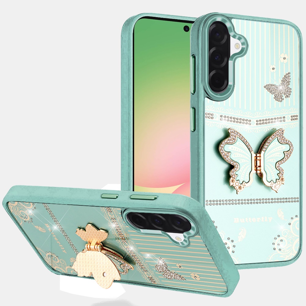 For Samsung Galaxy A57 Splendid Glitter Butterfly Design Stand with Metallic Edges Hybrid Case - Teal