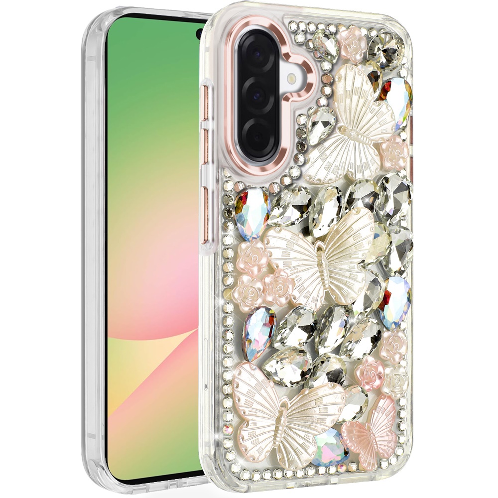 For Samsung Galaxy A57 Lavished Floral Butterfly Bling Stones Hybrid Case - Rose Gold