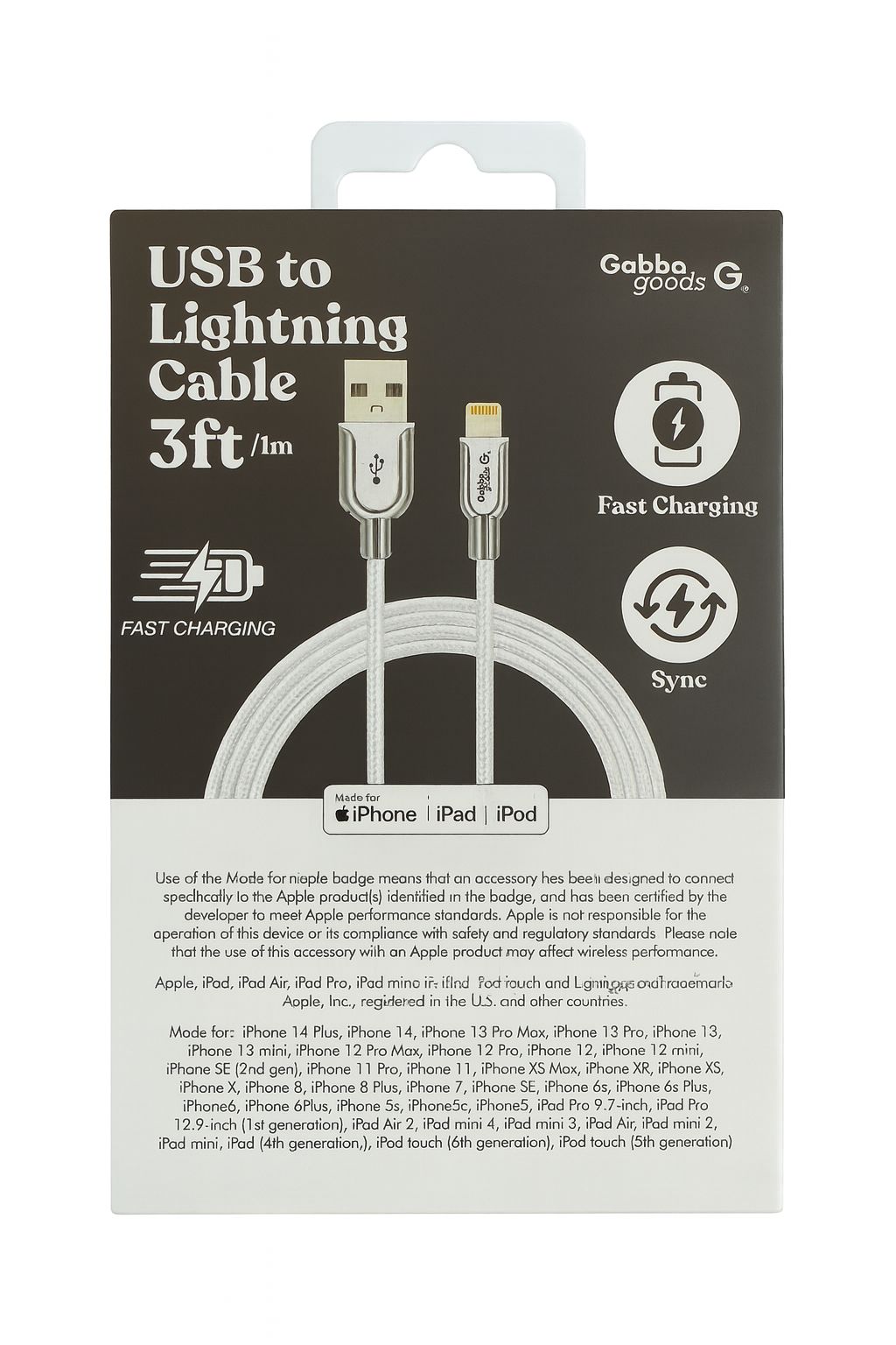 GG 3 FEET FAST CHARGE & SYNC CERTIFIED USB TO LIGHTNING CABLE - GG-CLW3-WTSL - WHITE (D14 GG#E)