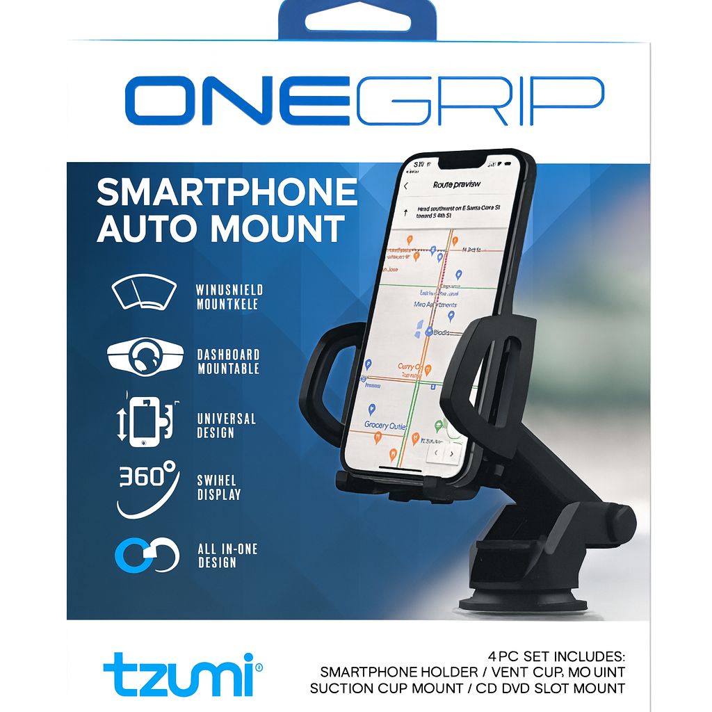 Tzumi One Grip Smartphone Auto Mount - 4 SETS - SMARTPHONE HOLDER, VENT CLIP MOUNT, CD SLOT MOUNT - SUCTION CUP MOUNT - BLACK (B17 BOTTOM)