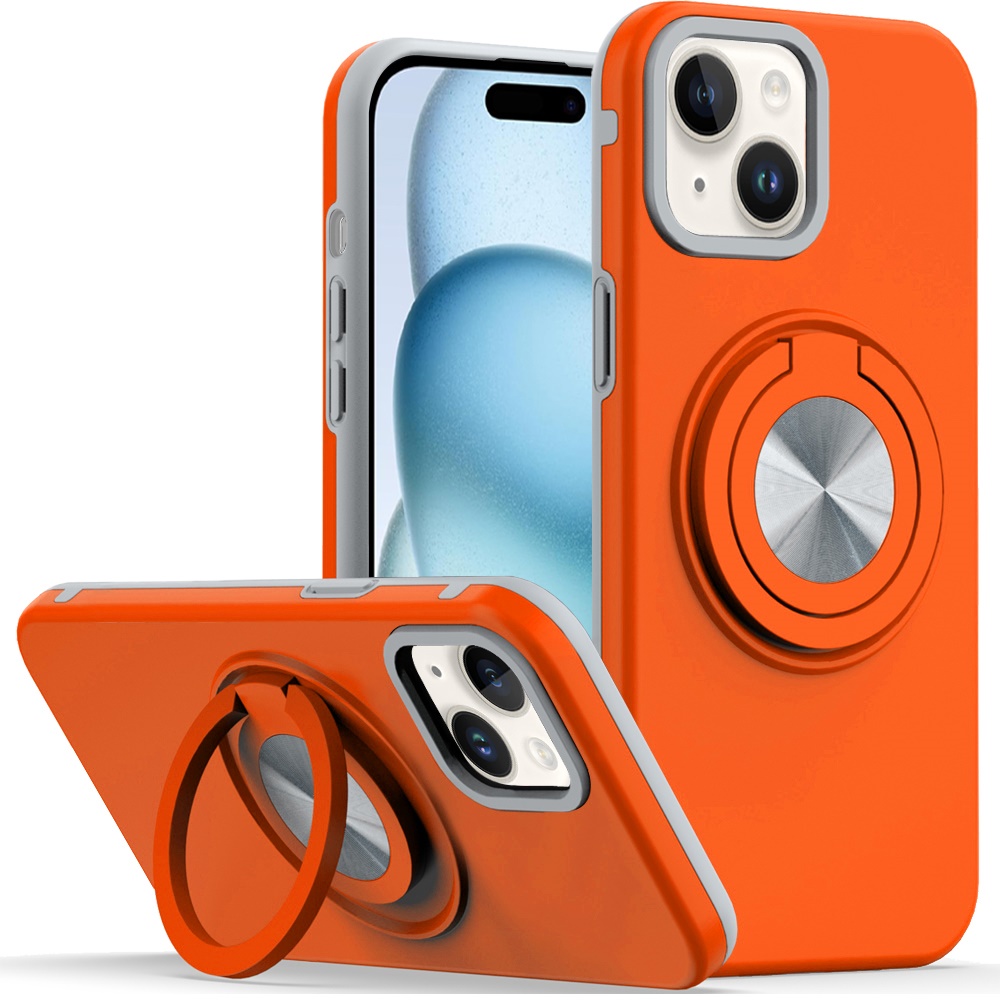 For iPhone 15 Plus/iPhone 14 Plus Metal CD Pattern Matte Finished Hybrid with Rotational Ring [Car Mount Friendly] Case - Cosmic Orange