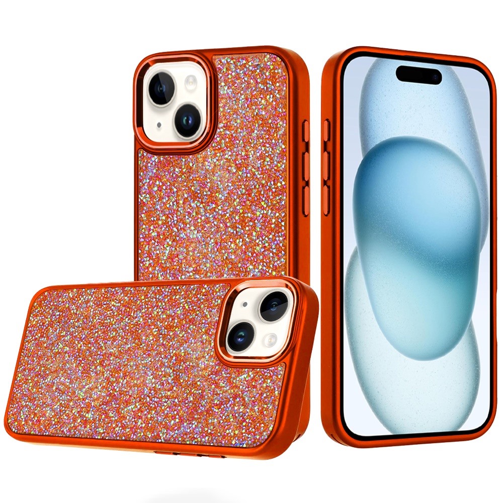 For iPhone 15 Plus/iPhone 14 Plus Crystal Glass Diamond with Metallic Buttons and Edges Hybrid Case - Cosmic Orange