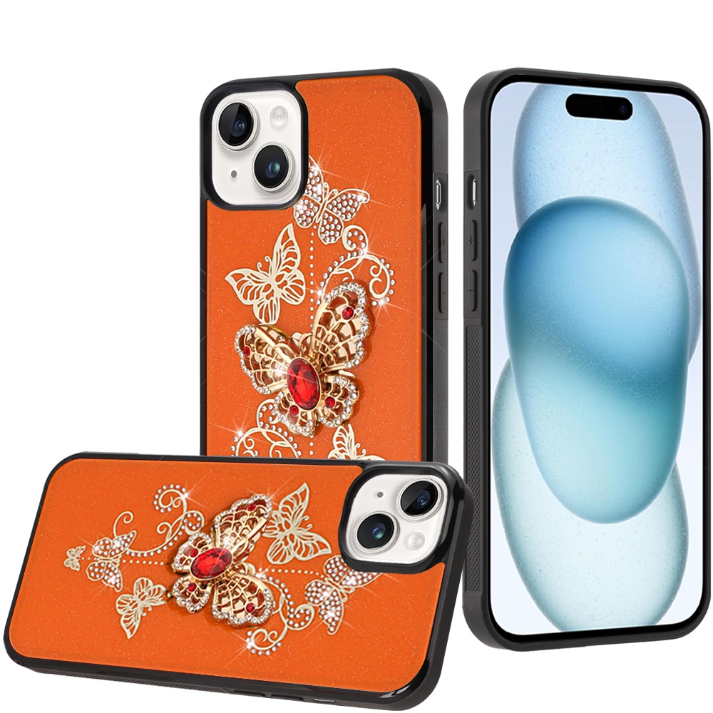 For iPhone 15 Plus/iPhone 14 Plus SPLENDID Diamond Glitter Ornaments Engraving Case Cover - Garden Butterflies Cosmic Orange