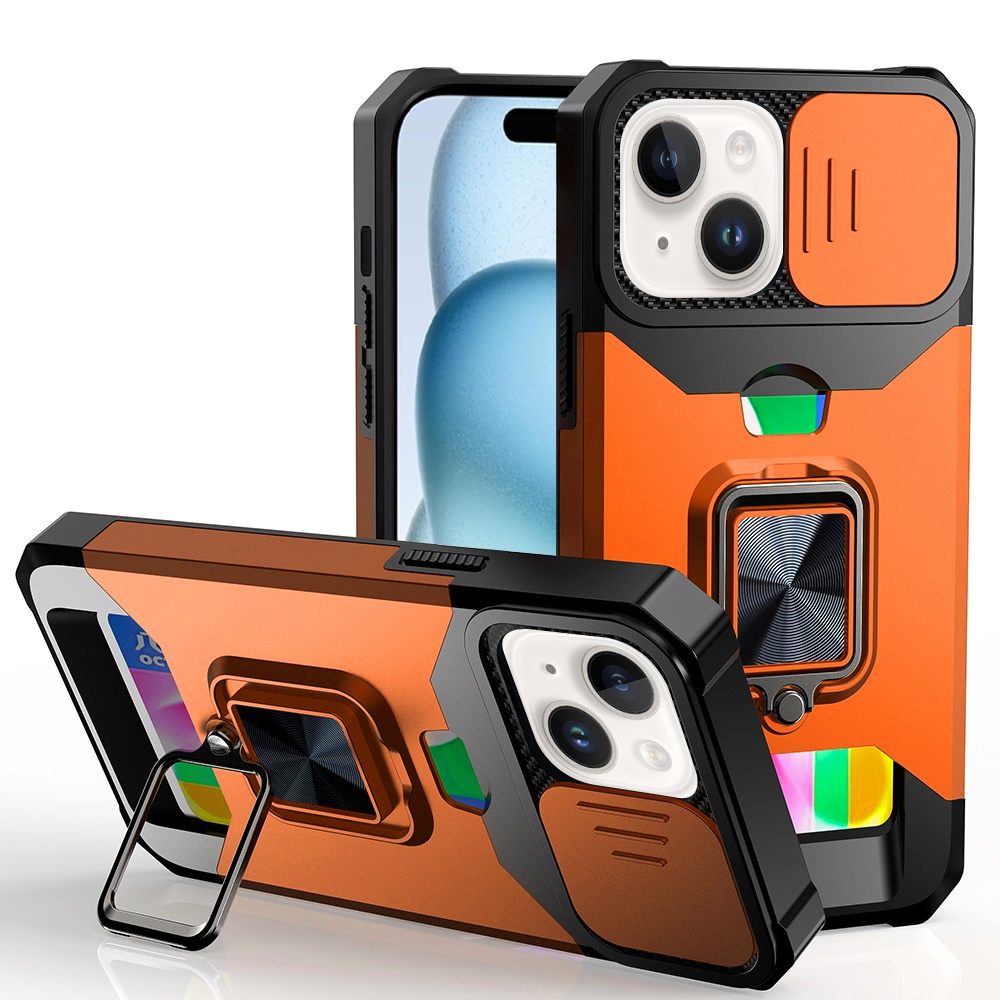 For iPhone 15 Multi-Functional Card Magnetic Ring Stand Hybrid Camera Case Cover - Cosmic Orange