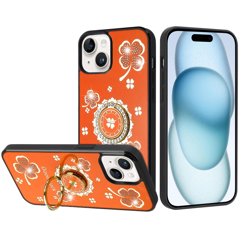 For iPhone 15 SPLENDID Diamond Glitter Ornaments Engraving Case Cover - Good Luck Floral Cosmic Orange