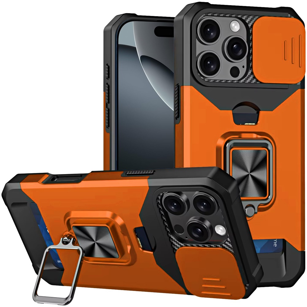 For iPhone 16 Pro Max 6.9 inch Multi-Functional Card Magnetic Ring Stand Hybrid Camera Case Cover - Cosmic Orange