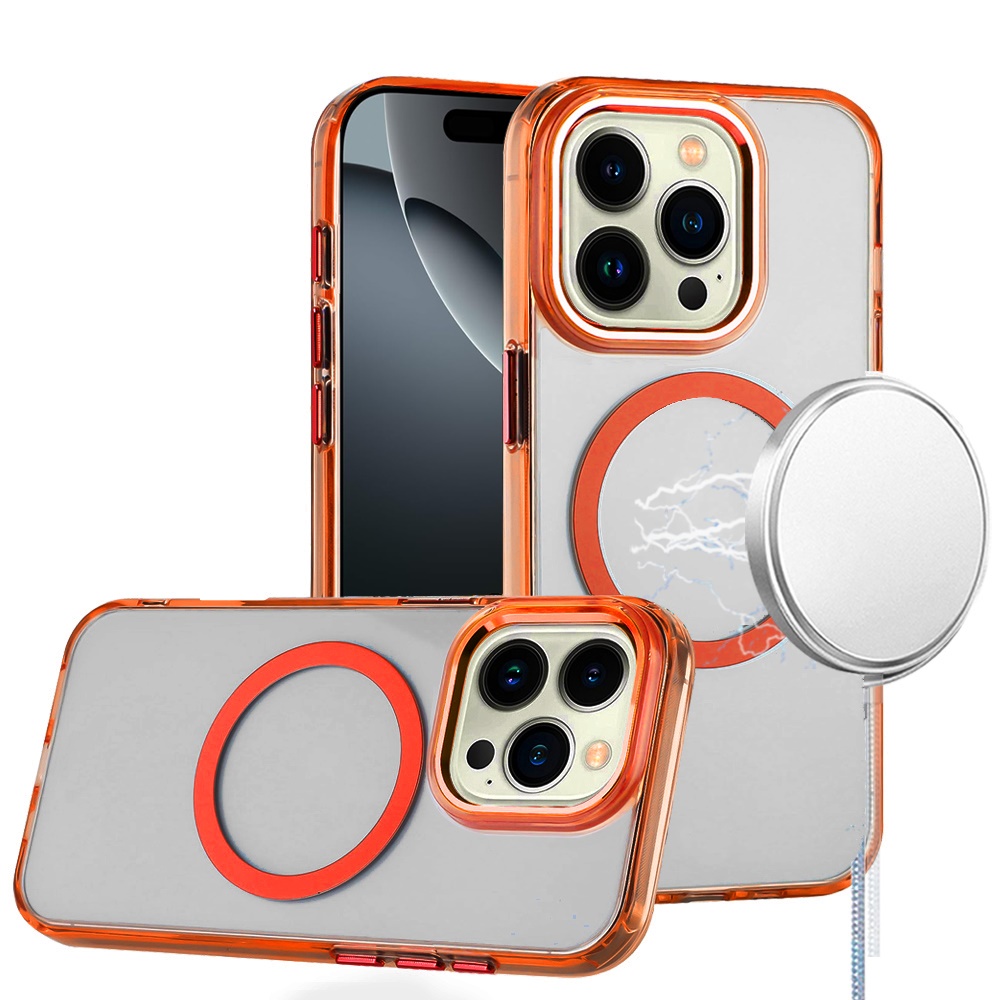 For iPhone 16 Pro Max 6.9 inch Magnetic Circle Ring Transparent Premium Acrylic with Metal Buttons & Camera Raised Lip - Cosmic Orange