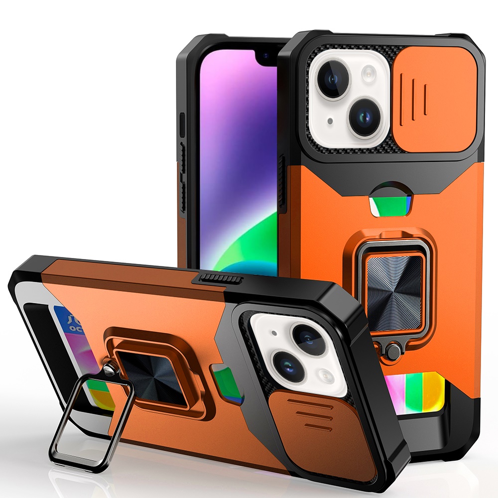 For iPhone 13/14 Multi-Functional Card Magnetic Ring Stand Hybrid Camera Case Cover - Cosmic Orange