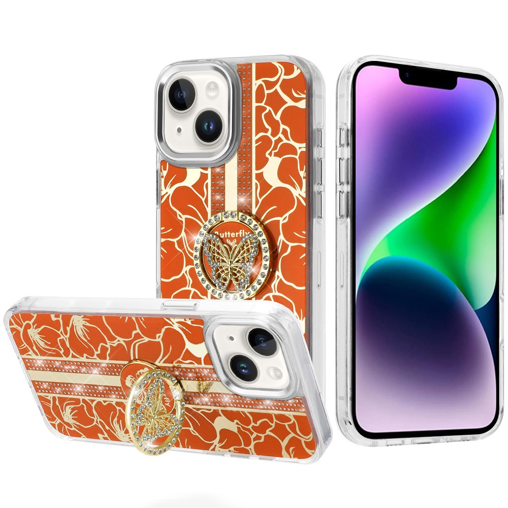 For iPhone 13/14 Splendid Floral Designs with Metal Camera and Buttons with Butterfly Ring Stand Hybrid Case - Cosmic Orange