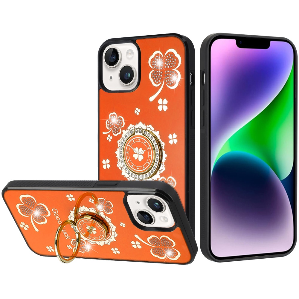 For iPhone 13/14 SPLENDID Diamond Glitter Ornaments Engraving Case Cover - Good Luck Floral Cosmic Orange