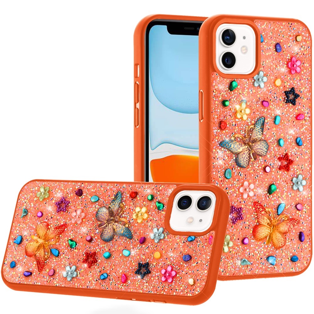 For iPhone 11 (XI6.1) Butterfly Ornaments Diamond Bling Glitter Hybrid Case - Cosmic Orange
