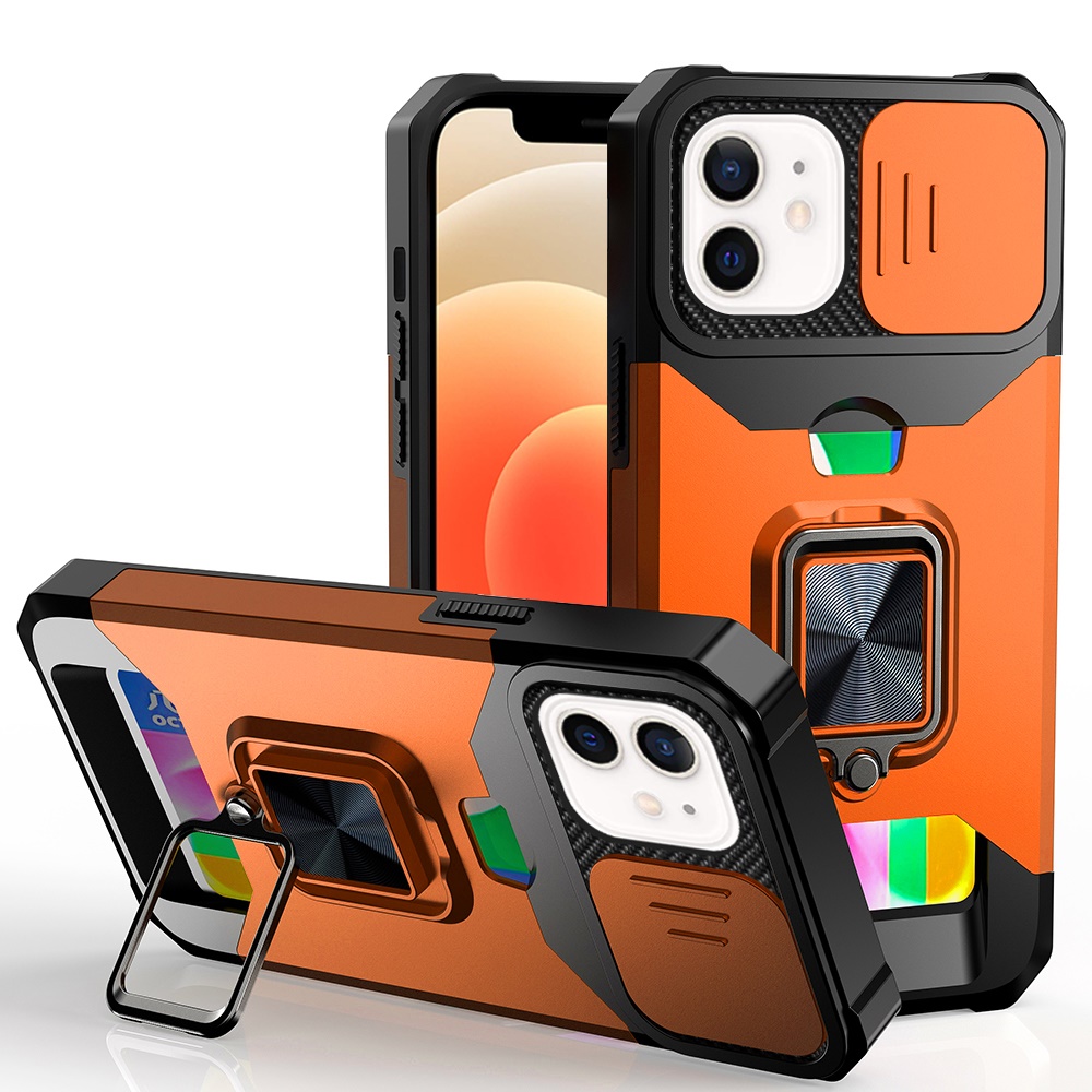 For iPhone 12 & iPhone 12 Pro Multi-Functional Card Magnetic Ring Stand Hybrid Camera Case Cover - Cosmic Orange