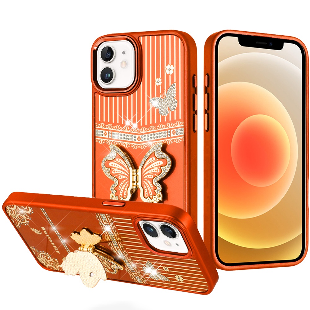 For iPhone 12 & iPhone 12 Pro Splendid Glitter Butterfly Design Stand with Metallic Edges Hybrid Case - Cosmic Orange